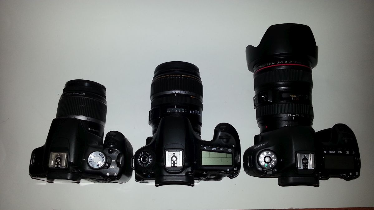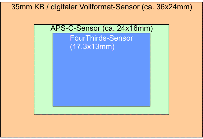 Fast alle Canon-Kameras haben einen APS-C Sensor mit den Maßen 22,5 mm × 15,0 mm. Die meisten kleineren Kameras von Nikon haben ähnliche Abmaße. Der Grund hierfür waren die ursprünglich teuren Fotosensoren. Schon seit längerem gibt es aber auch wieder Vollformat-Kameras, welche eigentlich als Kleinbild-Format-Kameras bezeichnet werden müssten. Sie beziehen sich auf das Format analoger Film-Kameras mit den Abmaßen 24 mm x 36 mm. Das Größenverhältnis von Vollformat zu APS-C wird Cropfaktor genannt und ist bei Canon 1,6 (Nikon hat eine Crop von 1,5 da die Sensormaße leicht unterschiedlich sind). Die Folge daraus ist ein scheinbar größerer Zoom, da nur eine kleinere Fläche des Belichtungskreises vom Objektiv verwendet wird. Nutzt man also eine 50 mm Linse mit einem APS-C Sensor, so bräuchte man mit einem Vollformat-Sensor 50 mm * 1,6 = 80 mm Brennweite für den selben Bildausschnitt. Die folgende Grafik stellt das Verhältnis der Größen dar. Als weiteren Vergleich ist ein FourThird-Sensor (ein 4/3 Zoll auf der langen Kante) abgebildet, wie er in vielen neueren Systemkameras vorkommt.