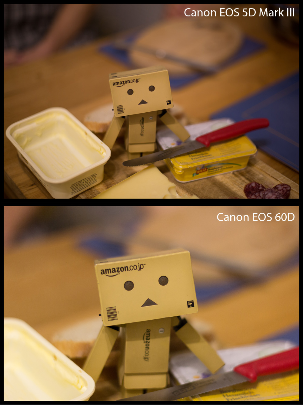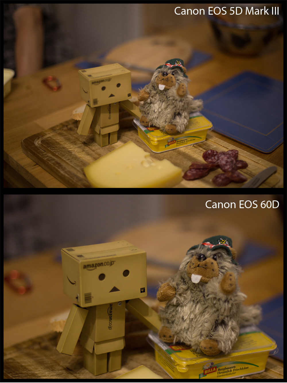 Bei einem KB-Sensor (Kleinbild) verringert sich die Schärfentiefe gegenüber einem APS-C-Sensor bei gleichem Bildwinkel auf Grund der dafür nötigen längeren Brennweite. Und wer sich nicht vorstellen kann, wieso auch ich scharf bin auf eine Canon Eos 6D oder 5D, kann sich den Unterschied an folgendem Beispiel selbst anschauen. Fotografiert wurde mit einer 50 mm Festbrennweite bei einer Blende von 1,4 auf einem Stativ. Der leicht unterschiedliche Blickwinkel kommt vom Batteriegriff der 5D.