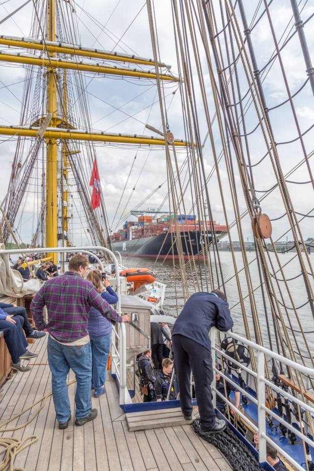 Am Freitag stand die Einlaufparade auf dem Programm. Ich hatte das Glück, auf dem Flagschiff der Parade mitzufahren – der Gorch Fock. Diesmal waren auch einige Zivilisten an Bord. Die Besatzung lies sich indes nur wenig von den Gästen stören und man konnte sie beim arbeiten und hissen der Segel beobachten und fotografieren. Während der Fahrt zum Startpunkt wurden wir gleich von mehreren großen Containerschiffen jenseits der 350 Meter überholt – haben wohl alle fluchtartig den Hafen verlassen bei so vielen kleinen Booten 😀