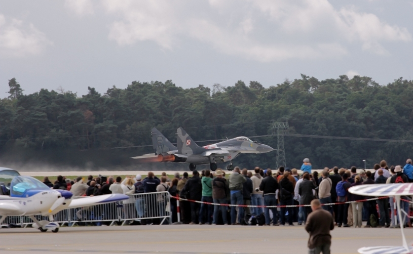 Den Anfang macht eine MiG-29 einer polnischen Staffel. Die beeindruckenden Flammen hinter dem Triebwerk sind der aktive Nachbrenner, bei dem zusätzliches Kerosin in das Triebwerk gestäubt wird, um den maximalen Schub zu erhöhen – entsprechend krass war auch die Lautstärkeentwicklung, die locker mit einem Manowar-Konzert konkurrieren könnte 😀