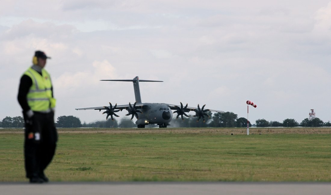 Der A400M benötigt selbst bei ungünstiger Witterung nichtmal 1000 Meter Landebahn, sodass er bereits wenige Augenblicke nach dem Aufsetzen zum stehen kam und dank seiner steuerbaren Rotorblätter soviel Schub erzeugen kann, dass er sogar ein Stück rückwärts rollte um sich zu drehen.