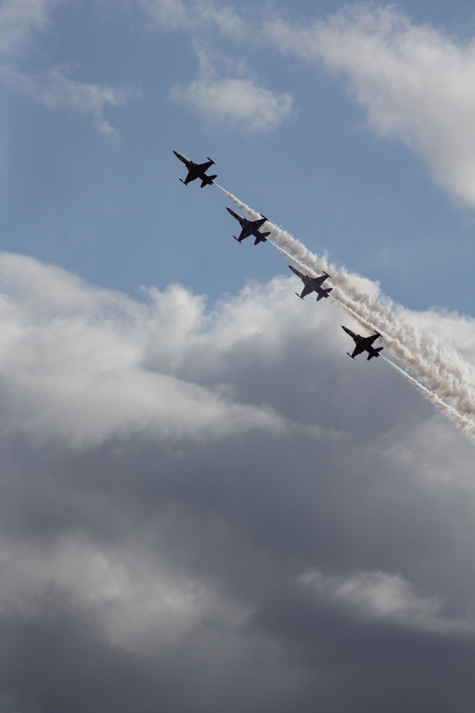 Sehr gut zu sehen sind im folgenden Bild wieder die Wirbelschleppen, die bei sehr engen Steilkurven entstehen. Bei genauem Hinschauen erkennt man sogar den Wirbel in der Wolke, die sich an den Strakes bilden. Sinn dieser meist unsichtbaren Luftwirbel ist es, auch bei sehr hohen Geschwindigkeiten die Luft stabil über die schmalen Flügel von Flugzeugen zu lenken.