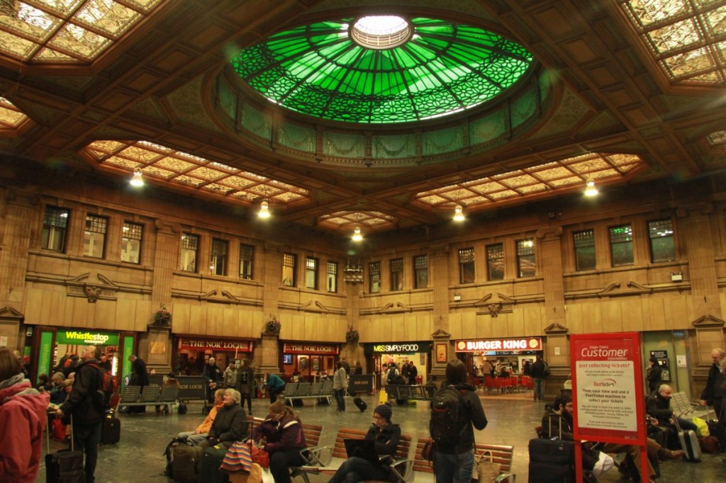Auf dem Rückweg ging es wieder über Edinburgh zurück nach Glasgow. Der Bahnhof in Edinburgh hat das Modell “Stuttgart 21” konsequent umgesetzt: anstatt den Bahnhof zu verbuddeln, wurde er einfach in ein Tal gebaut, das mitten durch die Stadt verläuft, und dann von oben mit einem (Glas)Dach verschlossen 😀