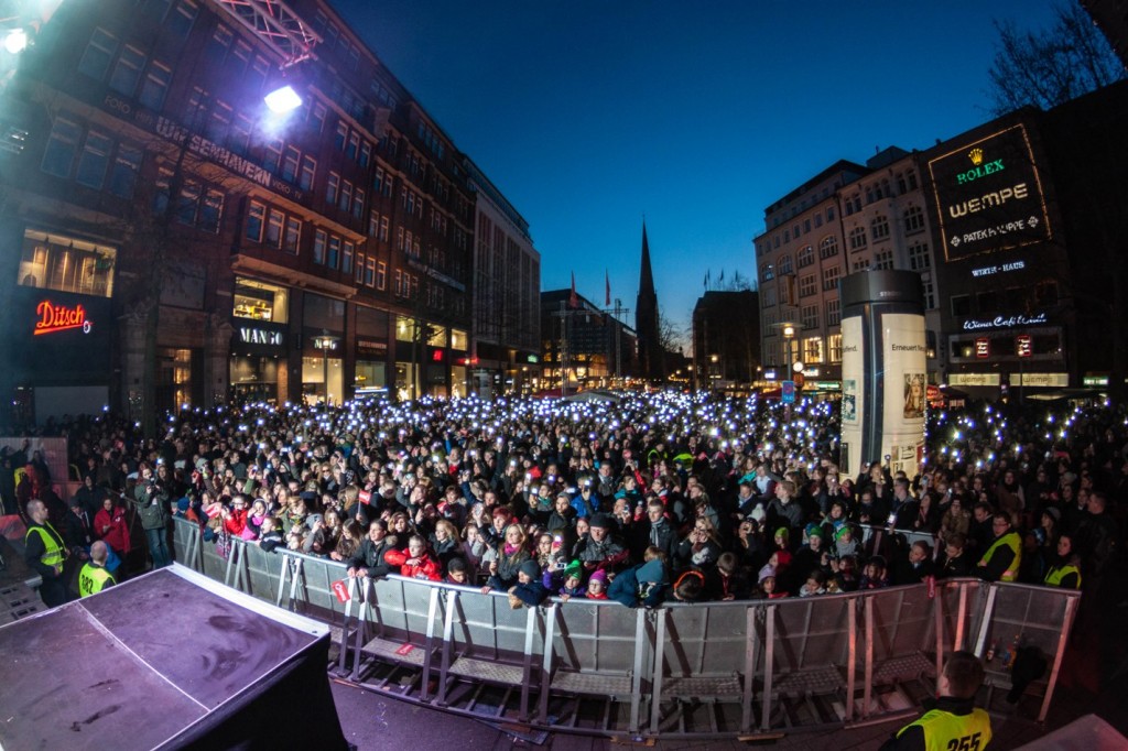 Da die Gelegenheit des unkomplizierten Zutritts und guten Wetters günstig waren, habe ich mir gleich nochmal für den Abend einen Termin gemacht. Zusammen mit Anton, einem befreundeten Fotografen, gings um 22 Uhr erneut auf den Channeltower. Neben der fantastischen Nachtsicht über das Lichtermeer der Ölverarbeitungsanlagen im Harburger Hafen war mein Hauptziel die Lichtinstallation “crossing the elbe” im Zusammenhang mit der internationalen Bauausstellung in Wilhelmsburg/Hamburg. Dabei werden jeden Abend (noch bis März 2014) 90 Minuten nach Sonnenuntergang 3 Strahler für 20 Minuten angestellt. Diese stehen in Harburg (PhoenixCenter), Wilhelmsburg (Energiebunker) und Hamburg (Spiegelgebäude, Hafencity) und strahlern mit einem sehr starken Spot über das Land. Nähare Infos zum genauen Zeitpunkt und wann die Stahler in welche Richtung leuchten, findet Ihr auf der Projektseite http://www.crossingtheelbe.com/