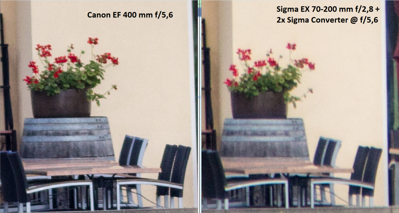 Fazit: Was die reine Bildleistung angeht ist das Canon-Objektiv klarer Sieger und ideal geeignet für meine hochauflösende Gigapan-Aufnahmen, wo es um kompromisslose Schärfe geht. Ebenfalls Sieger ist es was das Gewicht angeht, denn trotz einer massiven Gegenlichtblende ist es rund 20% leichter. Jedoch besitzt auch das Sigma seine Vorteile: So ist das Canon aussließlich auf 400 mm beschränkt, was in vielen Fällen einen sehr großen Abstand zum fotografierten Objekt erfordert, der nicht immer möglich ist. Auch der im Sigma vorhandene Bildstabilisator ist ein unendlich wichtiger Unterstützer bei der Fotografie aus der Hand ohne Stativ, hier lohnt sich das mehr investierte Geld. Somit würde ich sagen: unentschieden. Jede Linse hat ihr eigenes Spezialgebiet und man darf gespannt sein, welche Gigapans mit dem Canon in Zukunft zu bestaunen sein werden 🙂