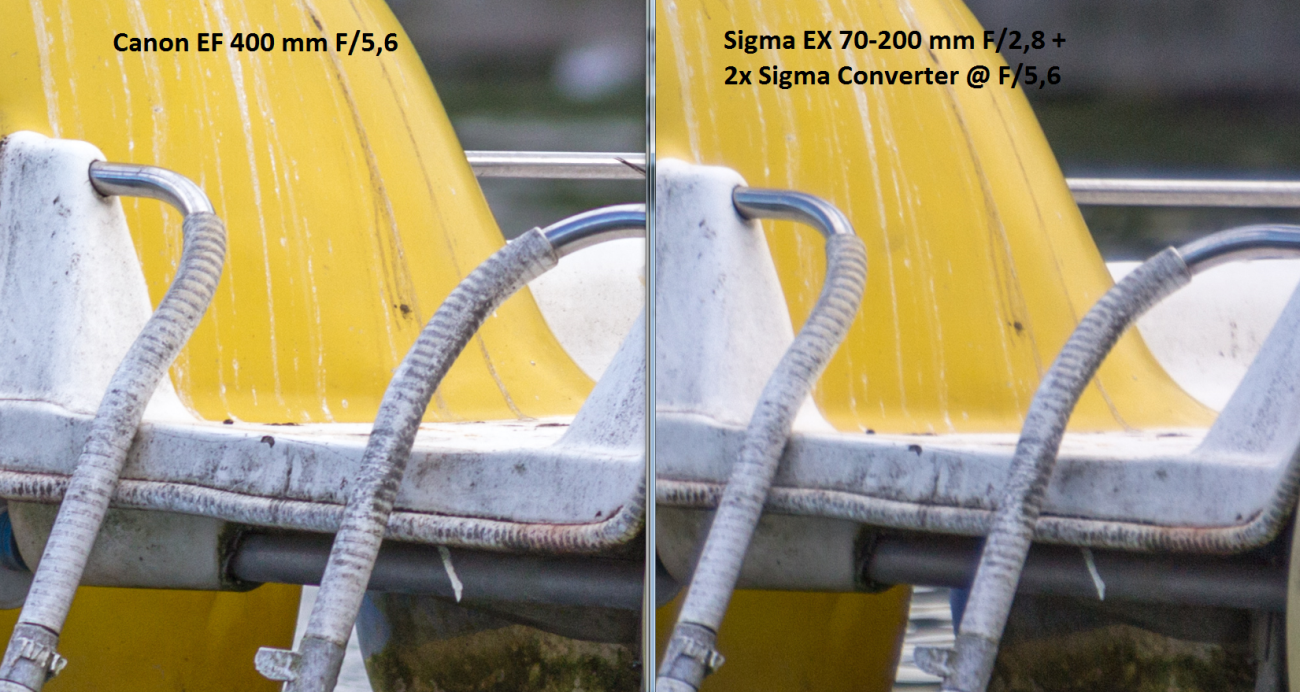 Das Objektiv hat ca. die selbe Länge wie mein 70-200 inkl. dem 2x Konverter, hat mit F/5,6 die selbe Anfangslichtstärke und ebenfalls ein 77 mm Filtergewinde. Im Preis liegen beide Lösungen ca. gleichauf: Das Sigma (1000 Euro) mit dem Konverter (288 Euro) liegt knapp unter dem Canon-L-Objektiv (1350 Euro). Das ein L-Objektiv kaum teurer ist mag auf den ersten Blick verwundern, allerdings handelt es sich hierbei ja auch um einen Festbrennweite, es hat also ausschließlich 400 mm und deckt nicht wie mein Sigma den Bereich bis 140 mm mit ab. Ein weiterer Grund ist das Fehlen eines Bildstabilisators bei Canon, welcher bei so hohen Brennweiten schon Gold wert sein kann. Diese “Nachteile” macht es jedoch wieder Wett mit anderen Eigenschaften. So ist der Schwerpunkt ein bisschen weiter in Richtung Kamera und ist mit 1413 Gramm leichter als das Sigma (1713 Gramm), was sich in der Handhabung schon stark bemerkbar macht. Typisch für L-Objektive von Canon (L wird gerne frei mit Luxus übersetzt ^^) ist die bestechend hohe Abbildungsleistung, welche ich auch kurz getestet habe. Leider war das Licht nicht stark genug, sodass ich keine rauschfreien Messungen mit höheren Blenden aufnehmen konnte.